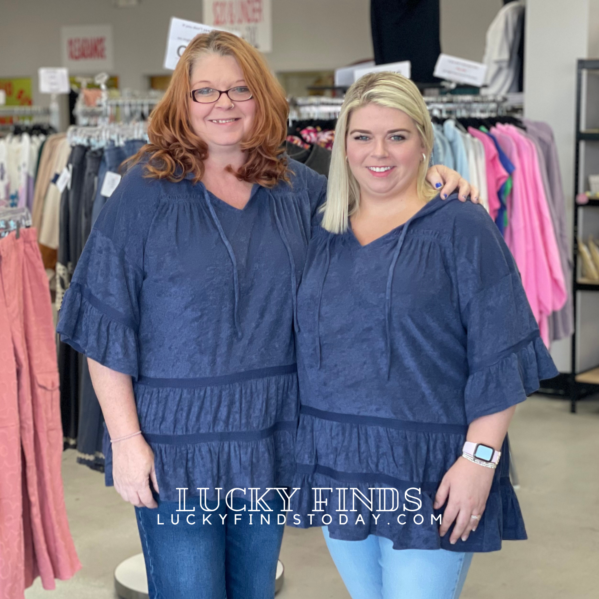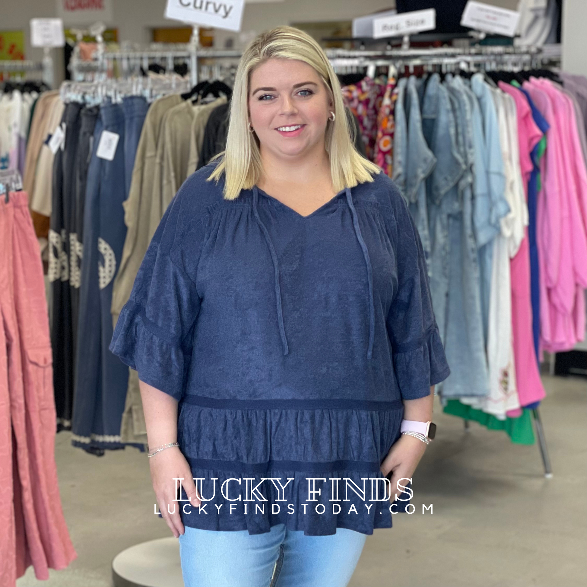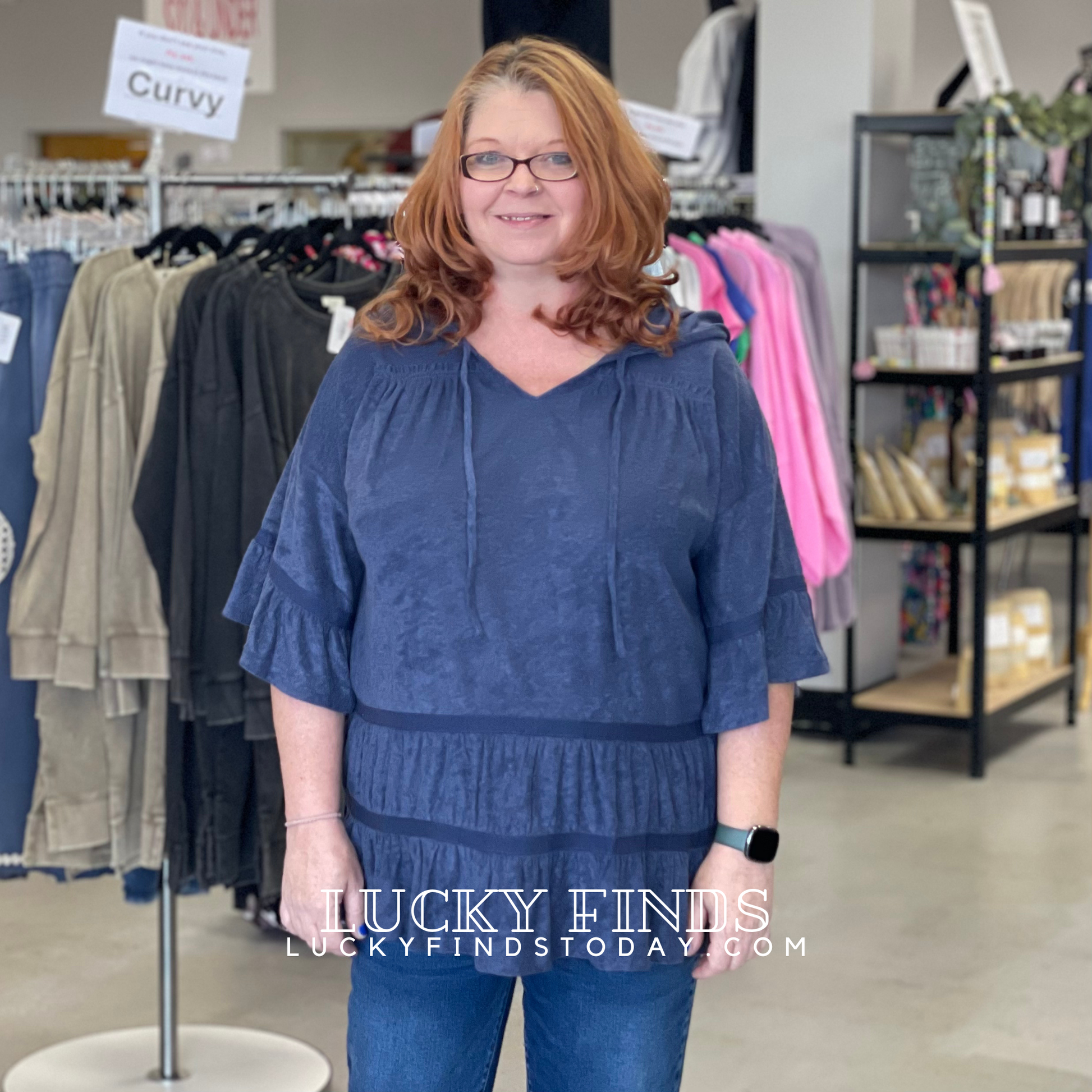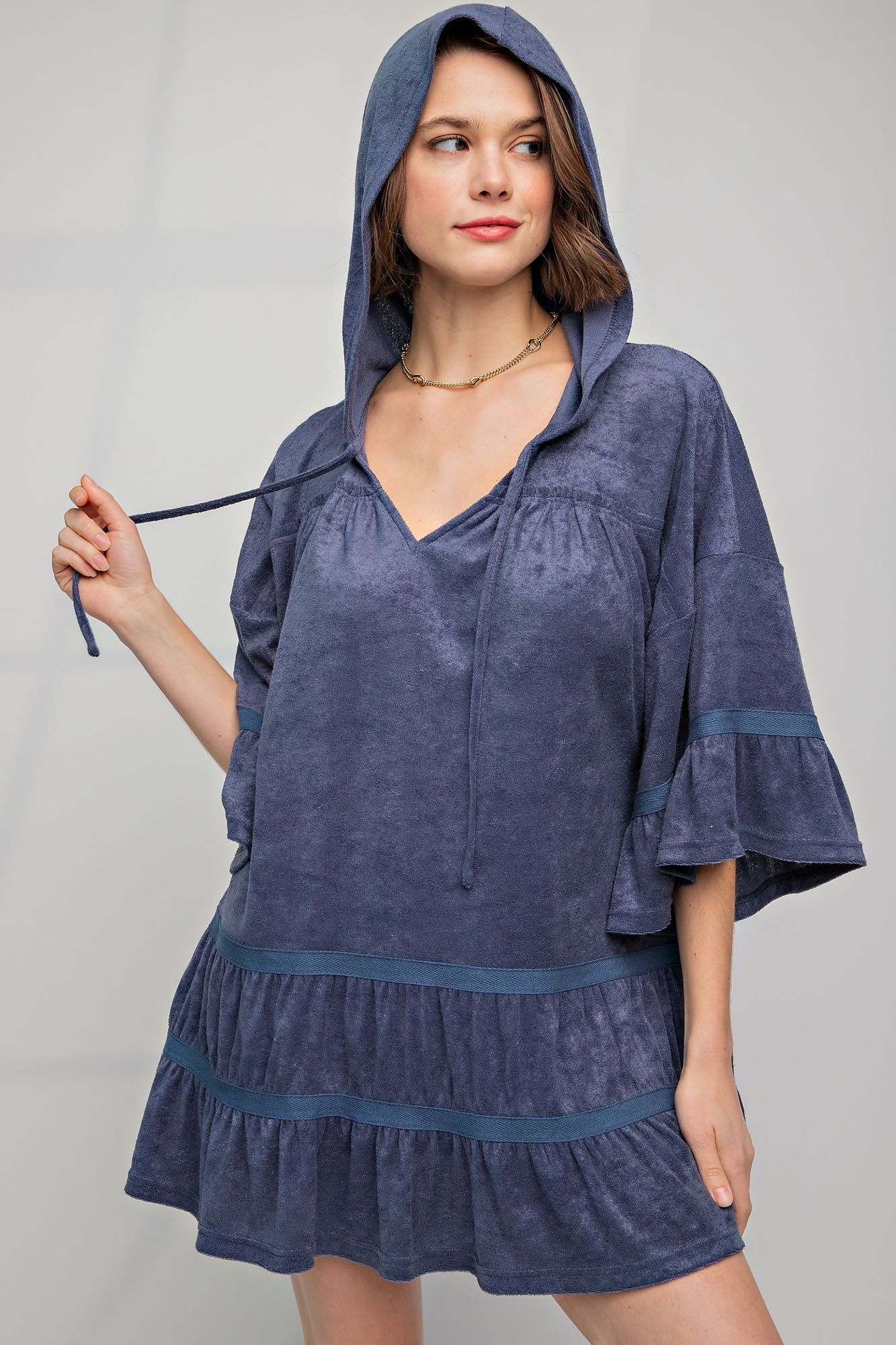 Soft Oversized Cotton V-Neck Tunic Hoodie w 3/4 Sleeves & Ruched, Ruffle Details