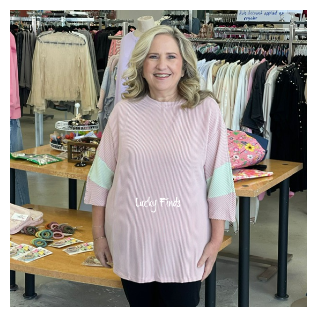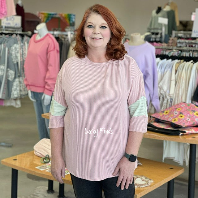 Oversized Corded Textured Color Block Top w 3/4 Sleeve & Flattering Fit