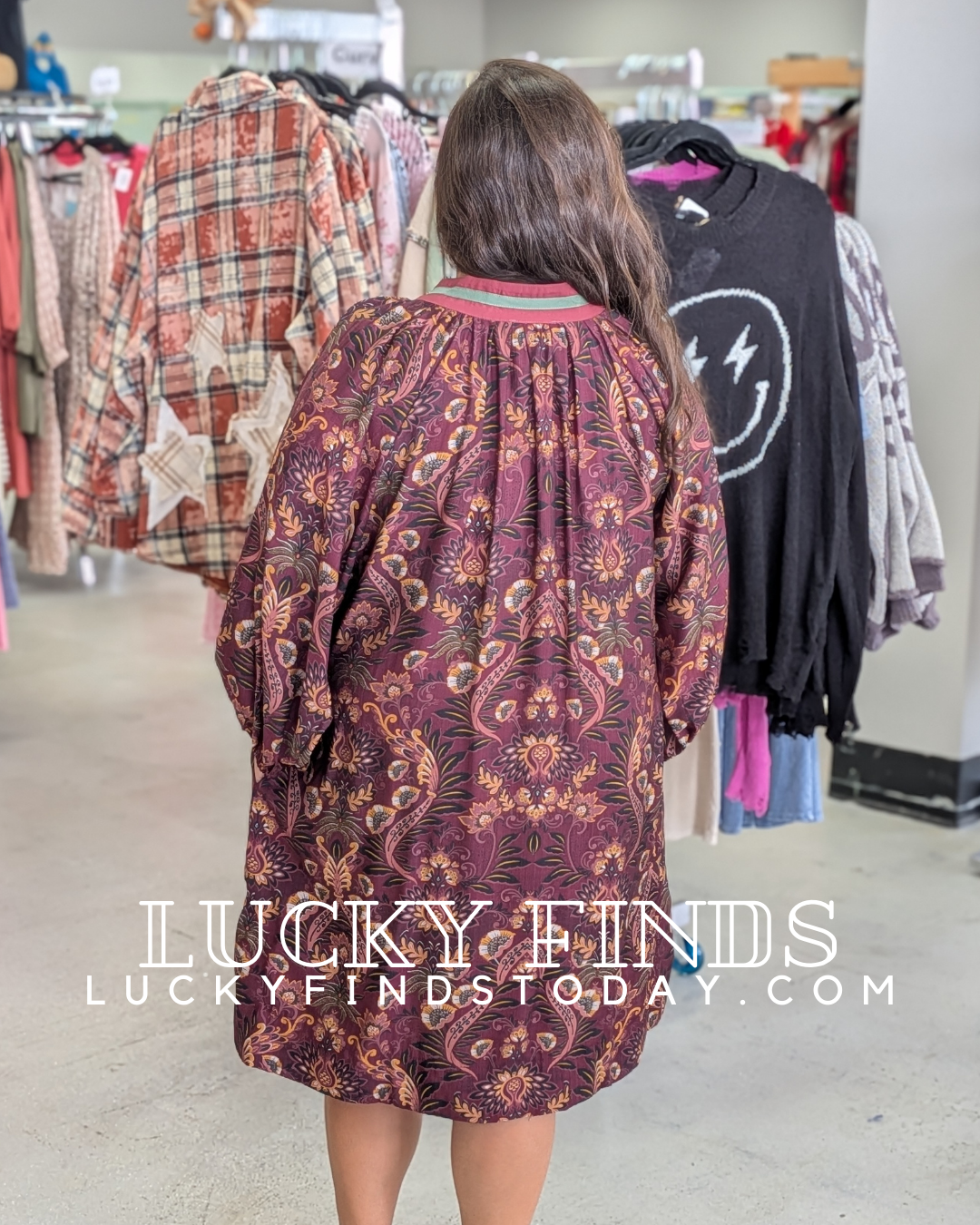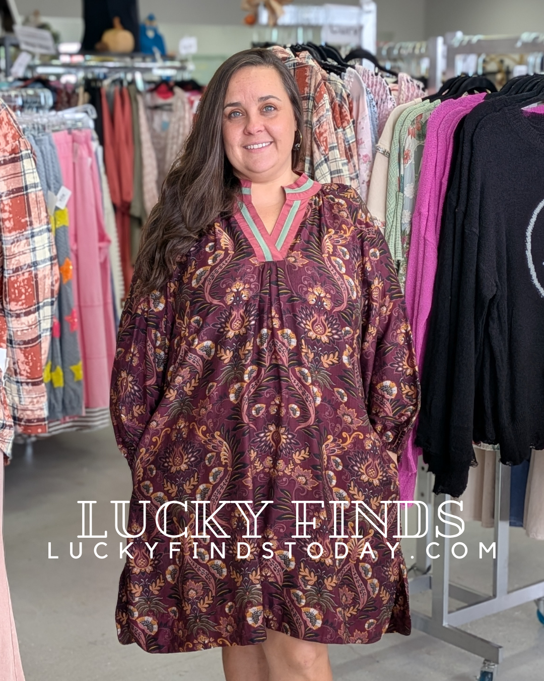 Elegant Floral Damask Print Collared Dress w V-neckline, Contrast Piping, Long Balloon Sleeve w Elastic Ruffle Cuff