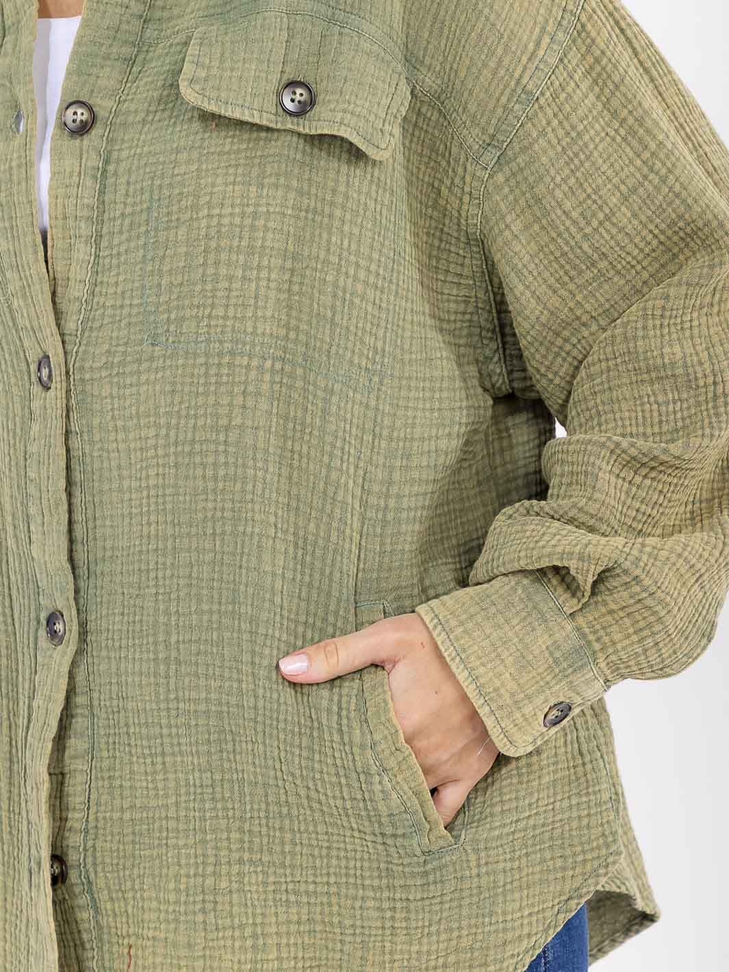 Vintage Washed Oversized Crinkle Textured Button Up Tunic Top w Pockets