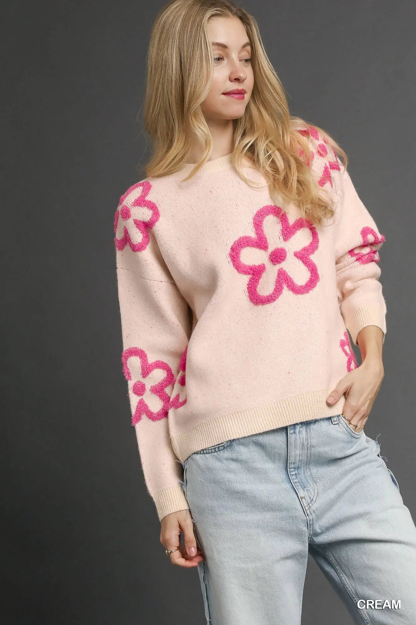 Oversized Floral Applique Knit Sweater with Classic Crew Neckline & Ribbed Cuffs