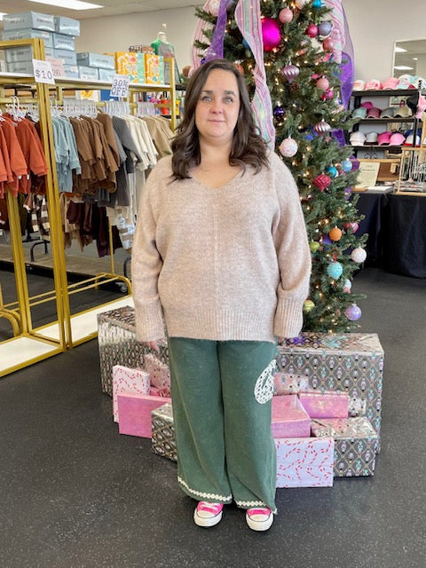 Mineral Wash Peace Lace Applique Waistband Wide Leg Pants w Pockets