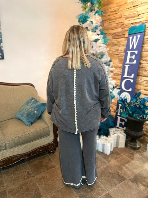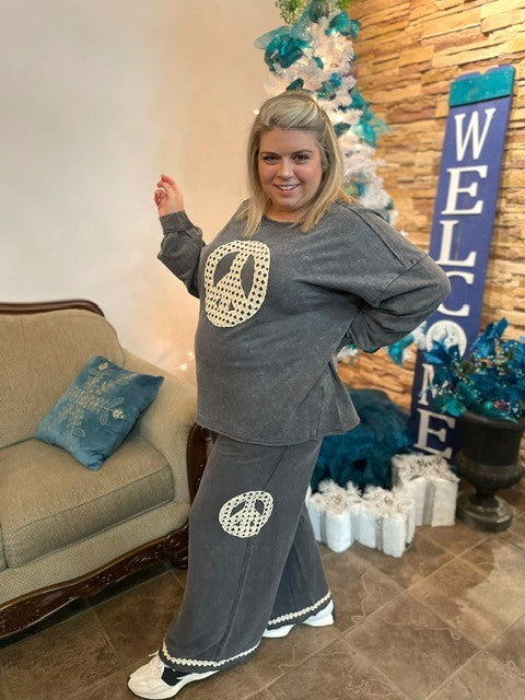 Mineral Wash Peace Lace Applique Waistband Wide Leg Pants w Pockets