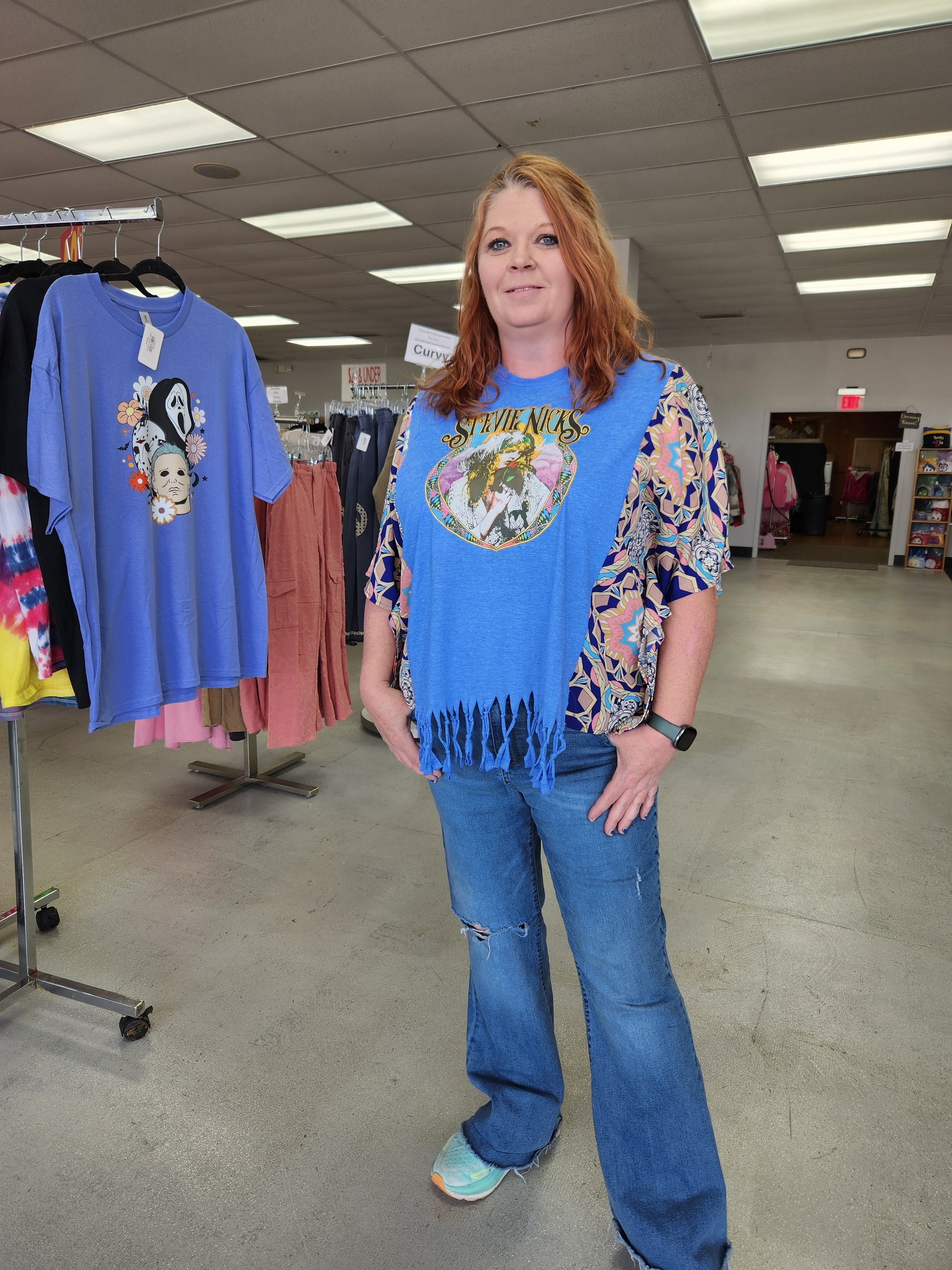 Upcycled graphic tshirt with a poncho style kimono.One of a Kind!! Handmade, the perfect combination gives you a vintage tee and a kimono flowy fit. One size fits most see measurements. 30 inches under the arms end to end , 26 inches long from top of shoulder to t shirt hem. One size fits all sizes Small thru 3XL