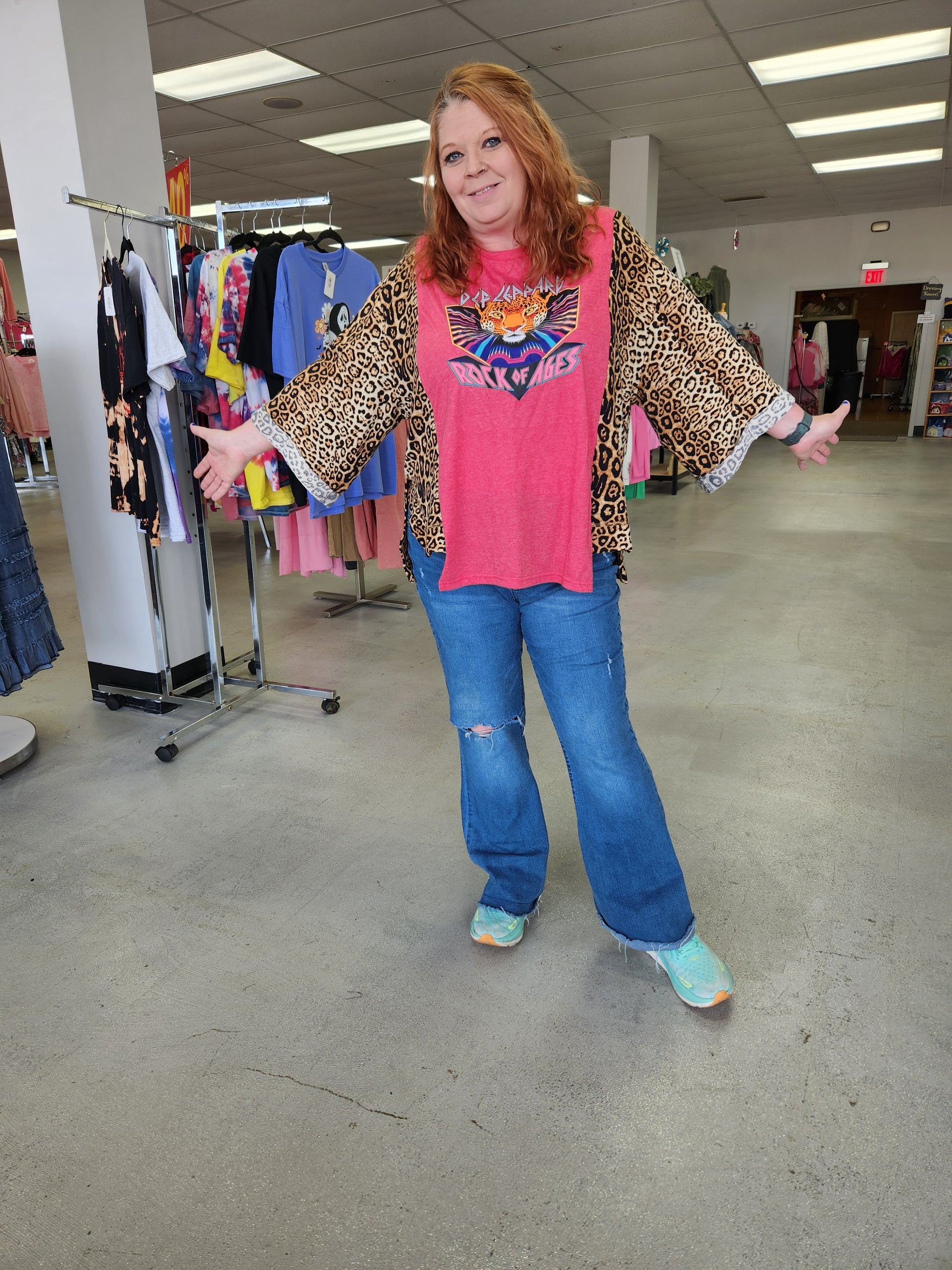 Upcycled graphic tshirt with a poncho style kimono.One of a Kind!! Handmade, the perfect combination gives you a vintage tee and a kimono flowy fit. One size fits most see measurements. 28 inches under the arms end to end , 29 inches long from top of shoulder to t shirt hem. One size fits all sizes Small thru 3XL