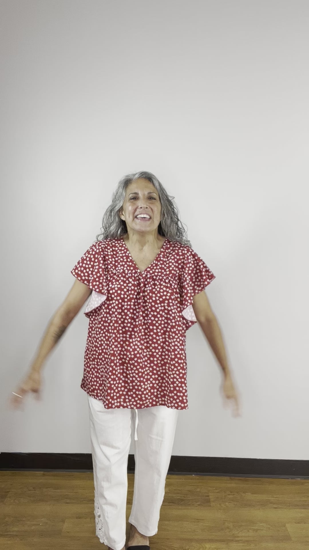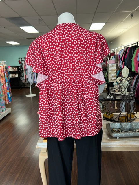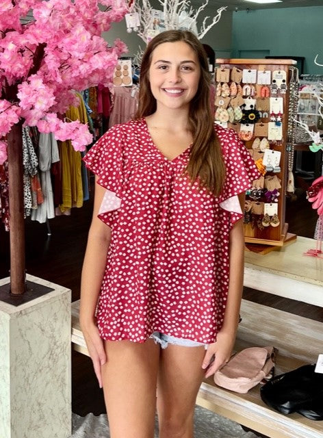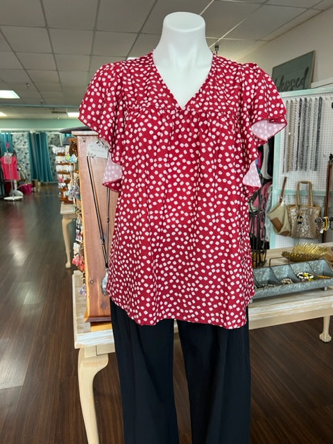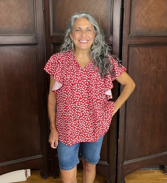 Exquisite Ditzy Floral Print Shift Top Featuring V-Neckline & Short Ruffle Sleeves