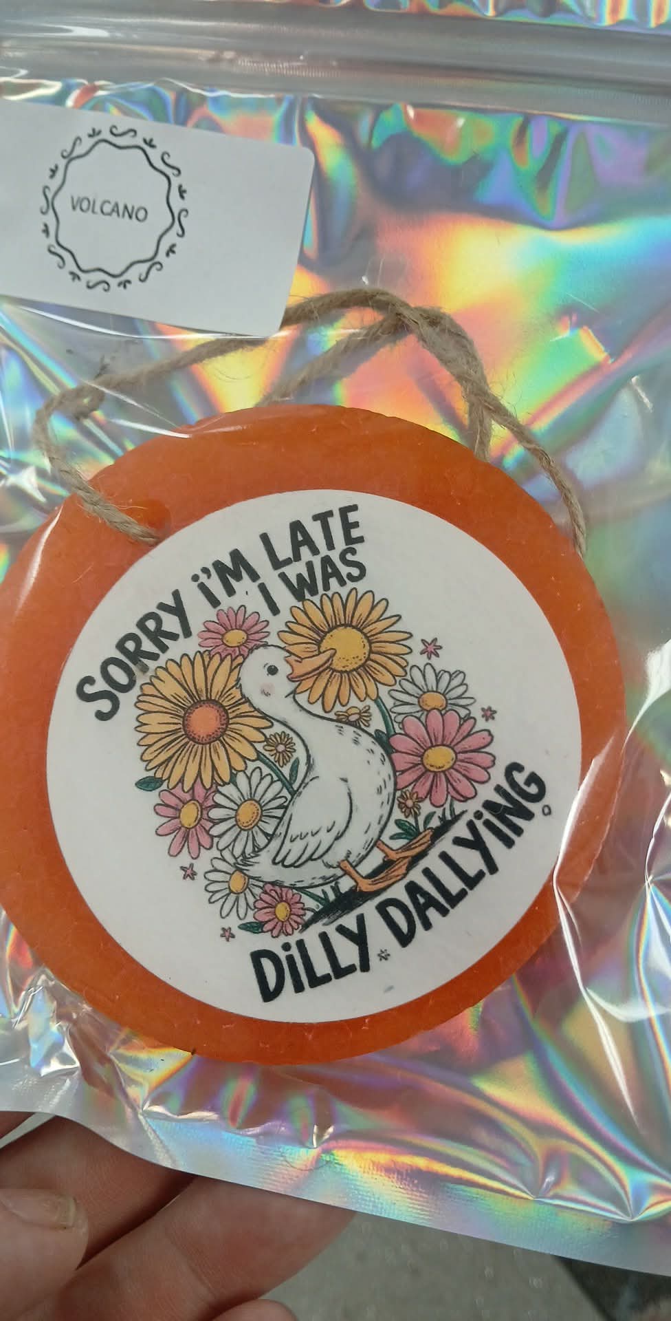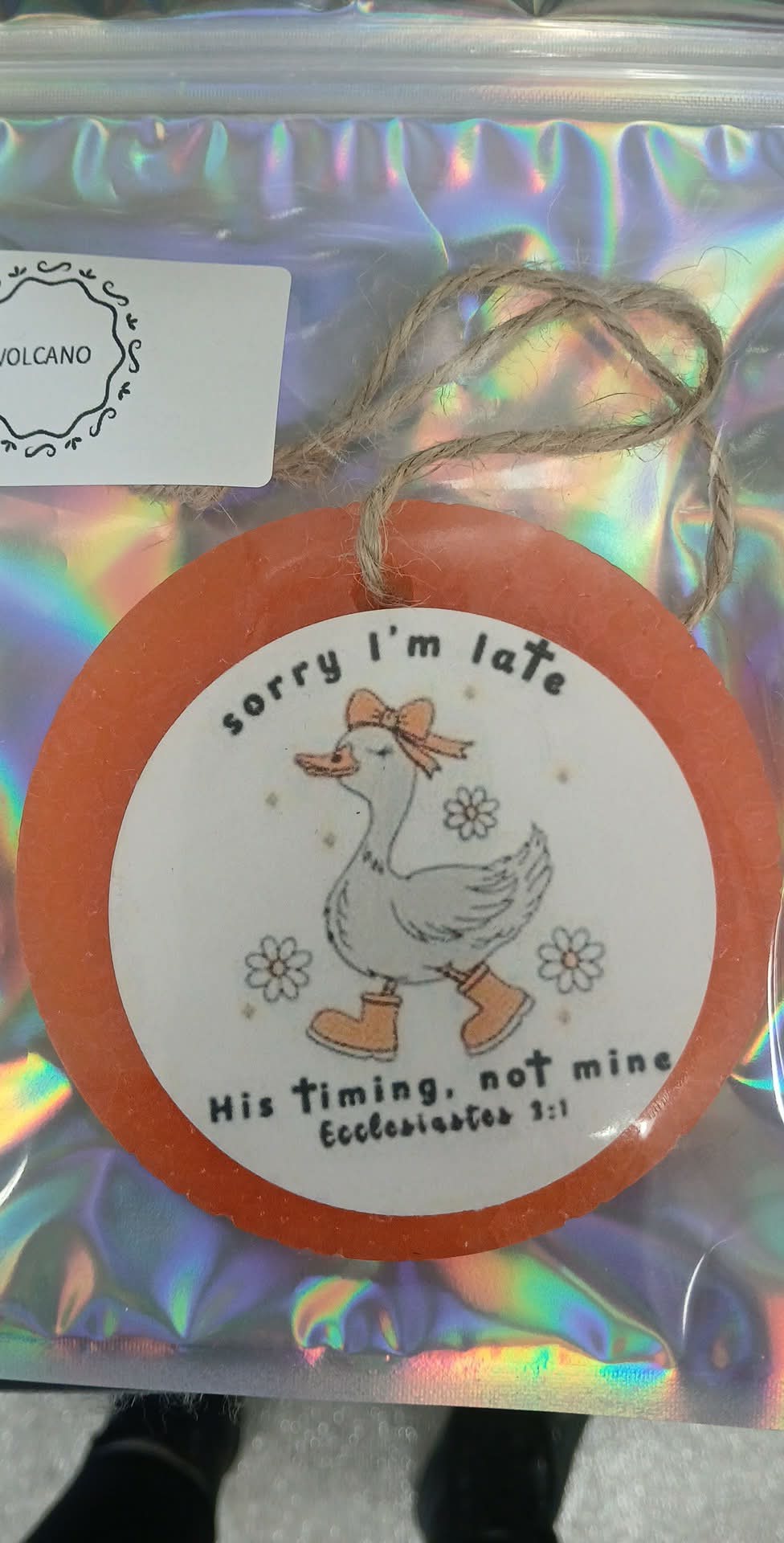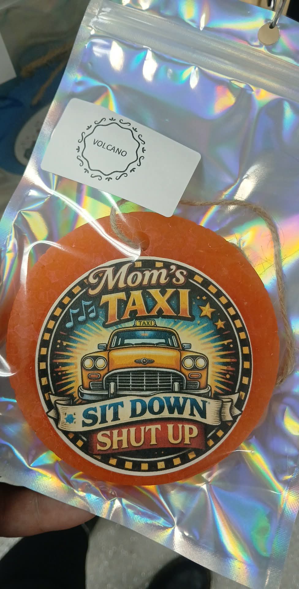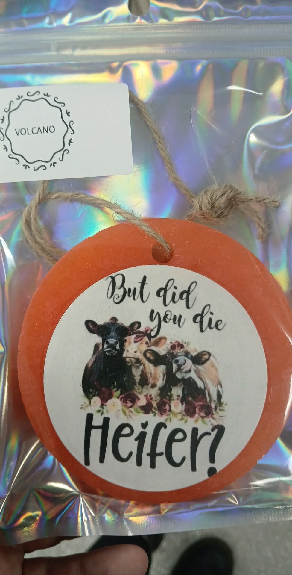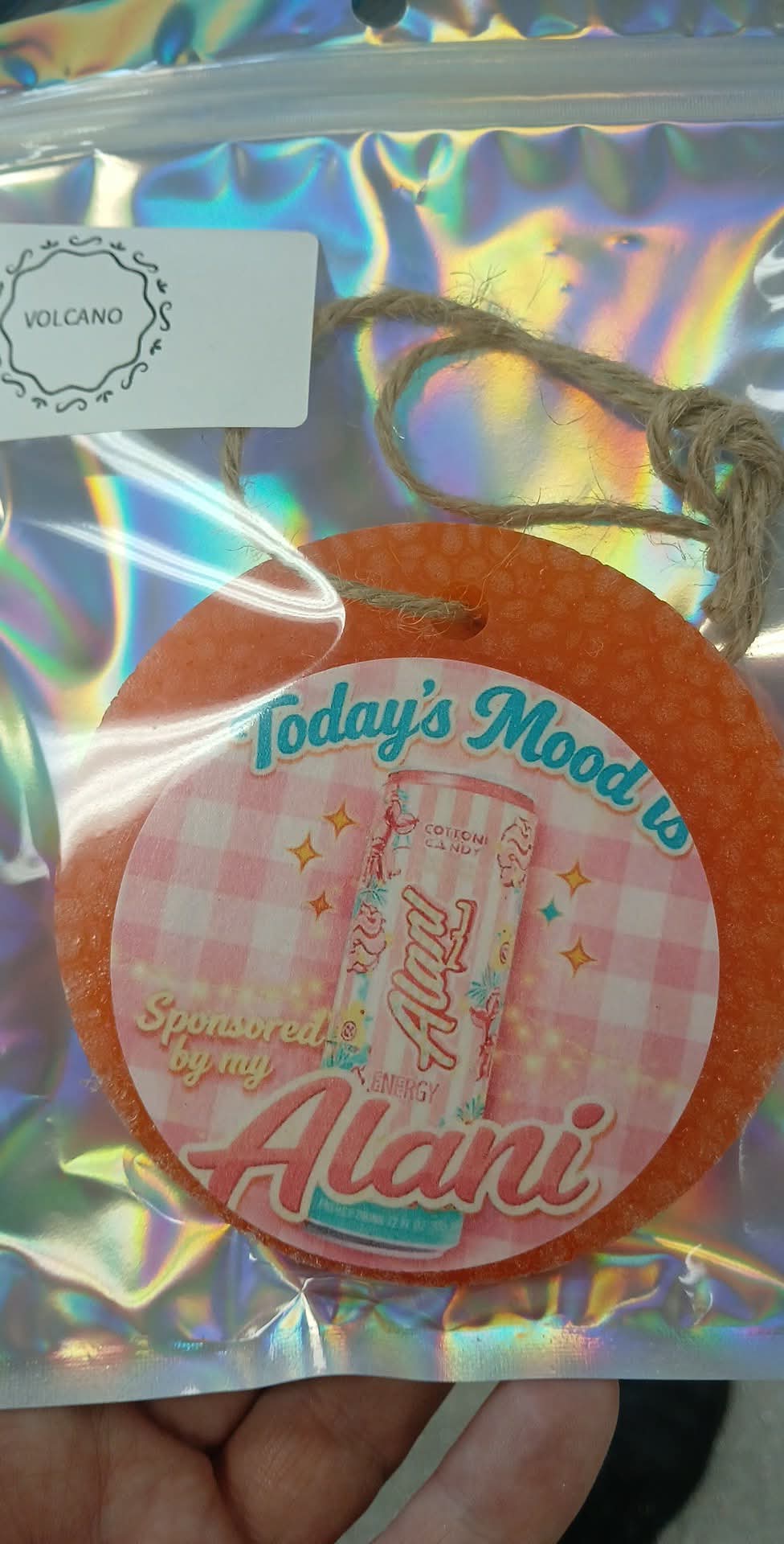 Volcano scented car freshie in a pretty peach color with a cardstock graphic attached