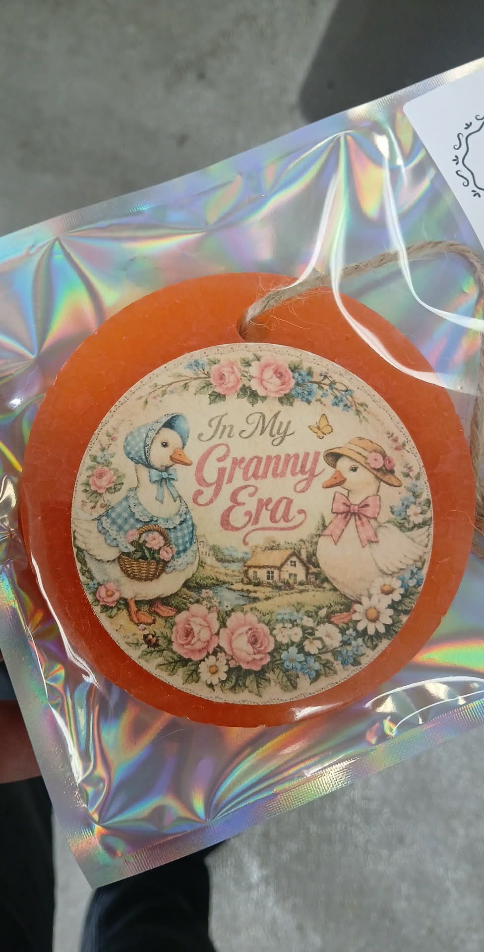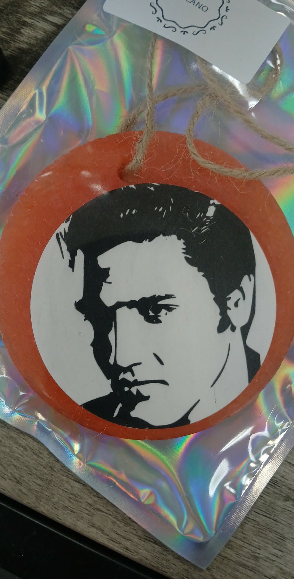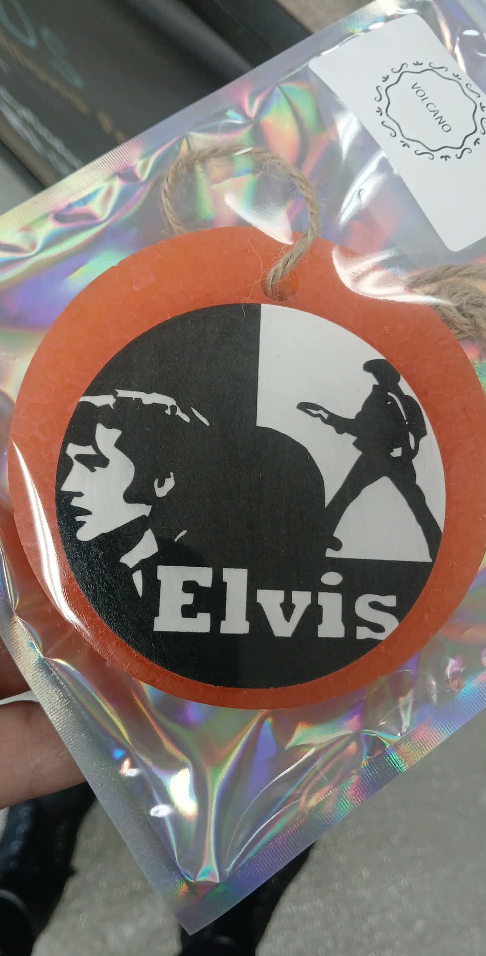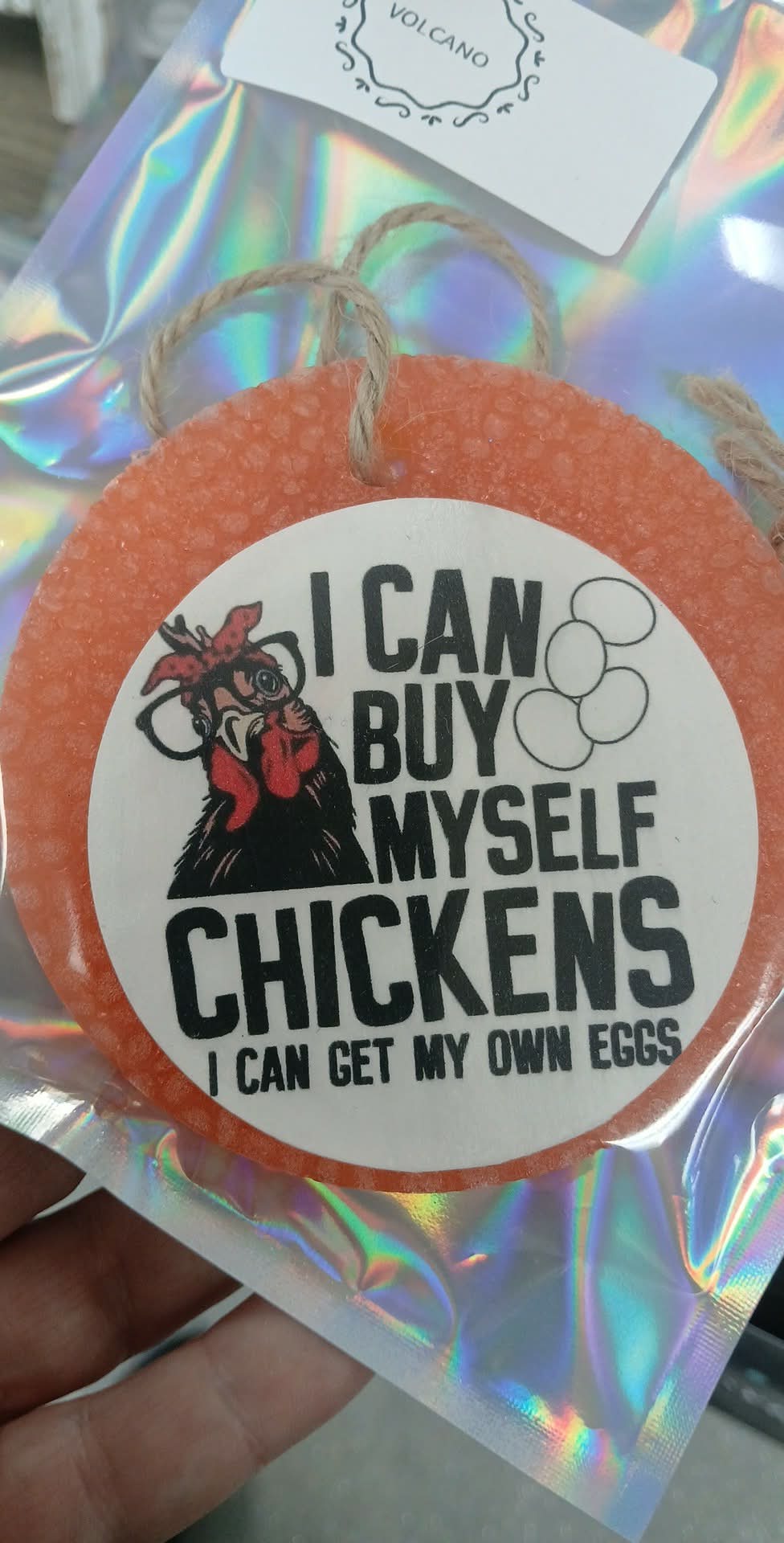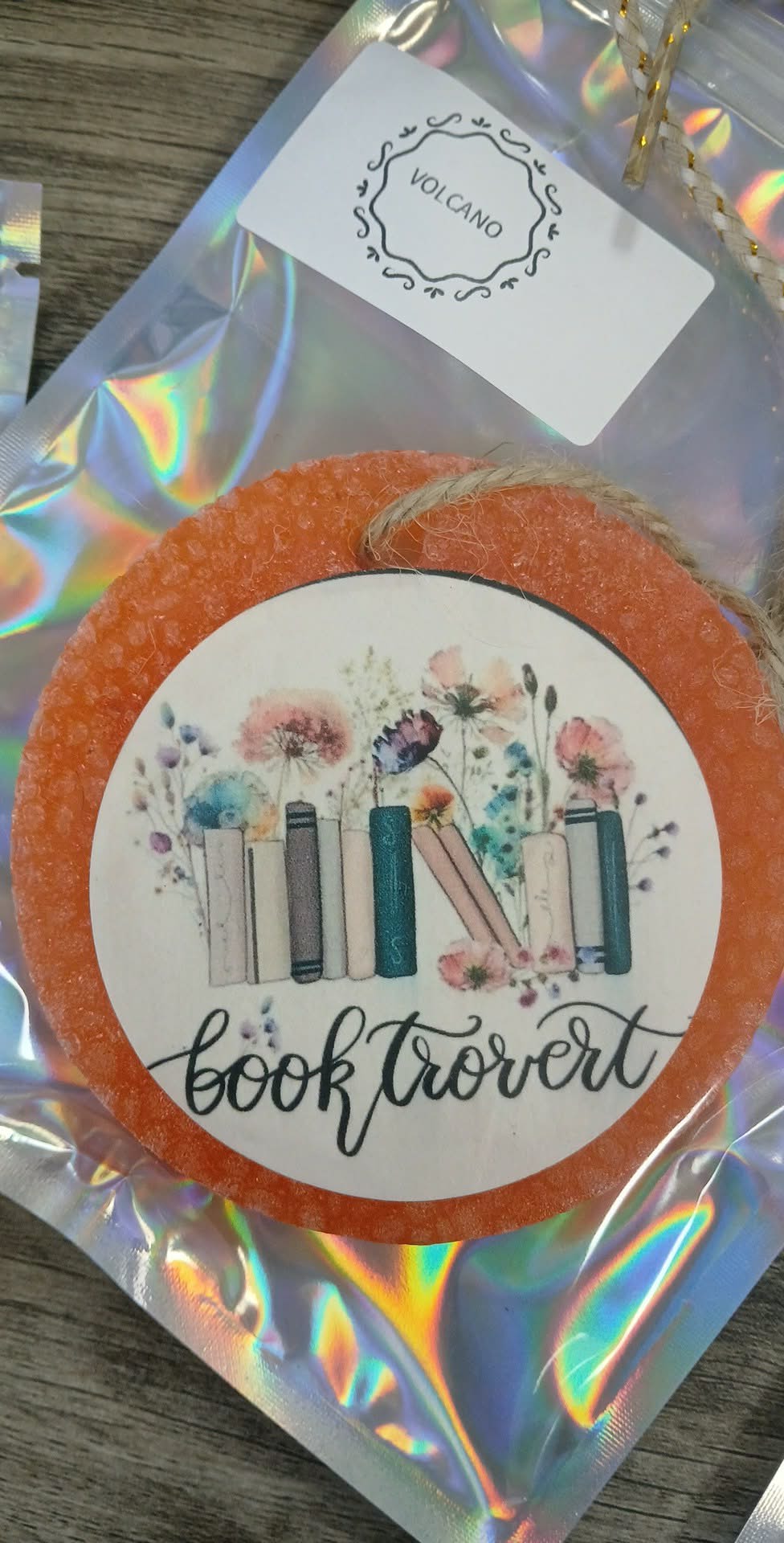 Volcano scented car freshie in a pretty peach color with a cardstock graphic attached