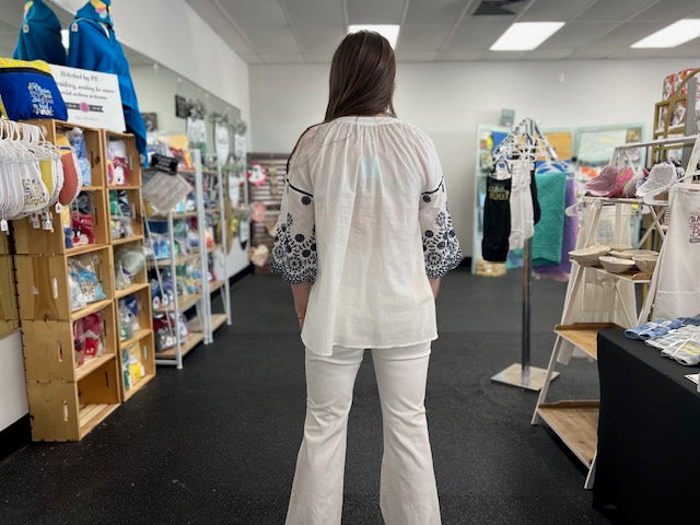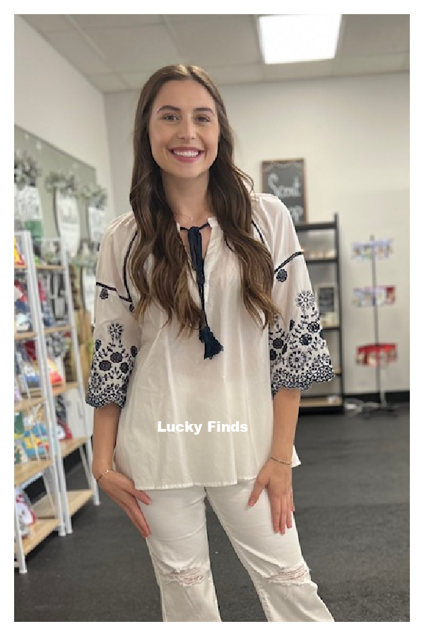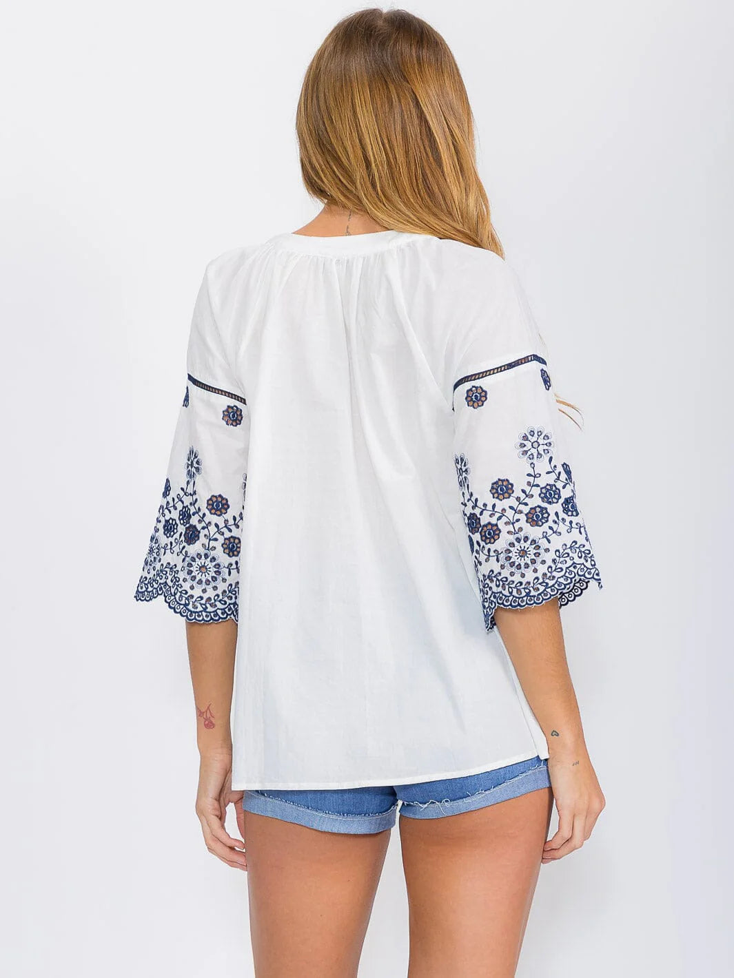 Stylish V-Neck Embridery Top w Half Sleeve & Front Tassel Tie