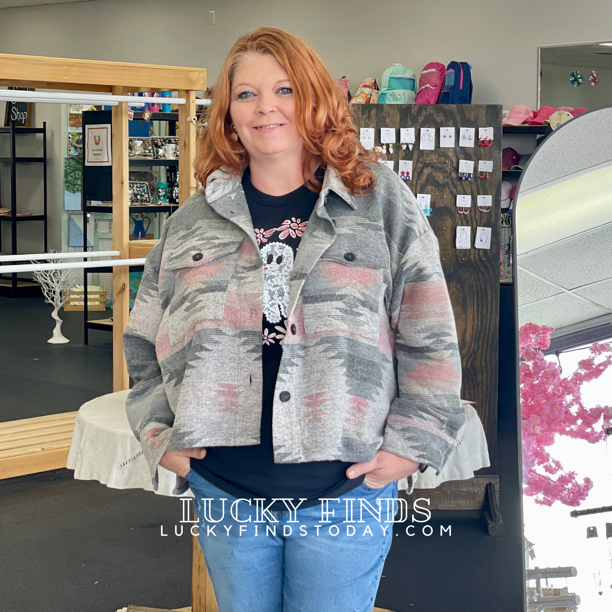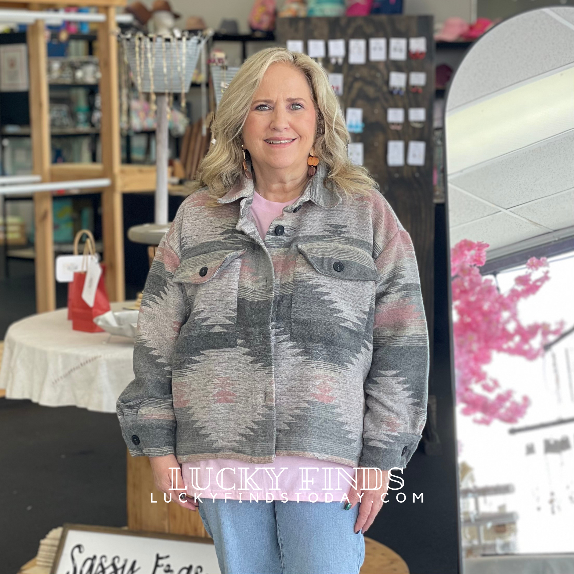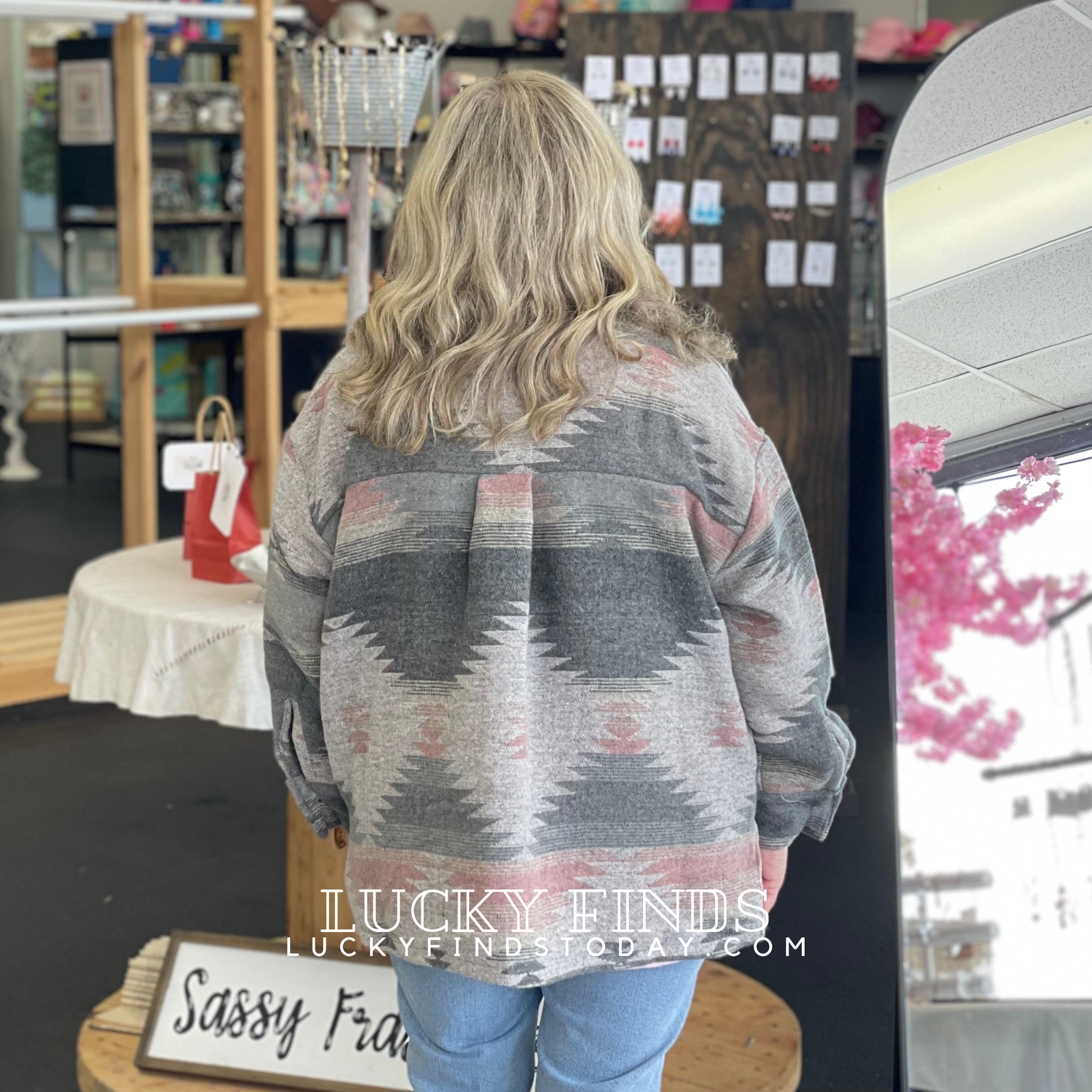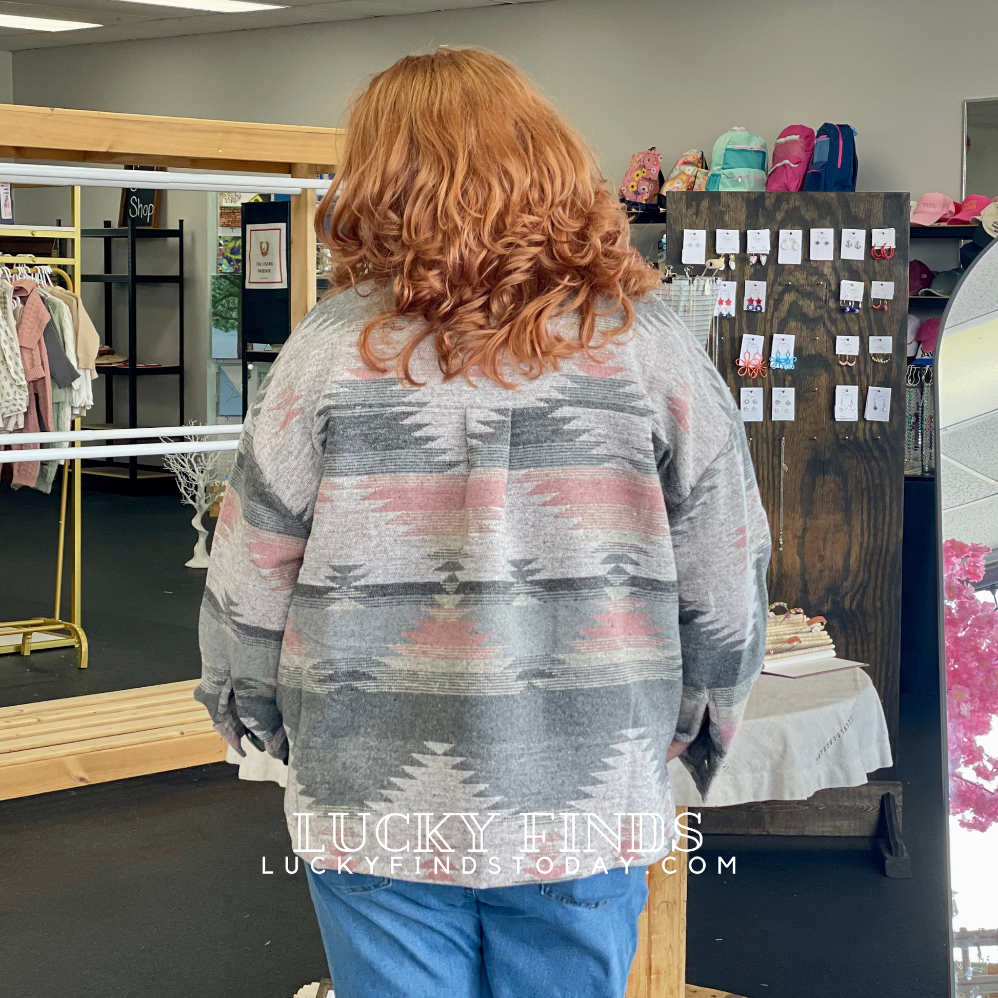 Cozy Oversized Aztec Print Button Down Shacket w Hi-Lo Hem & Chest Pockets