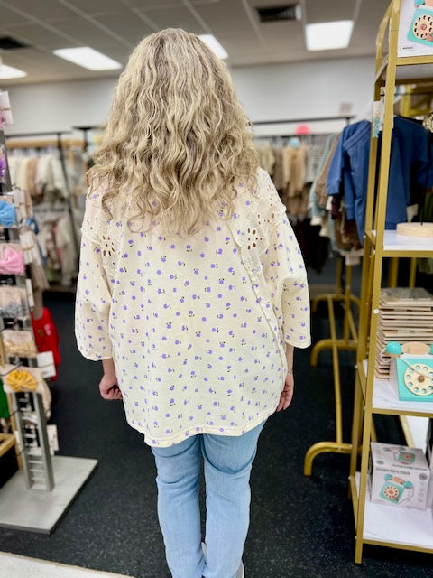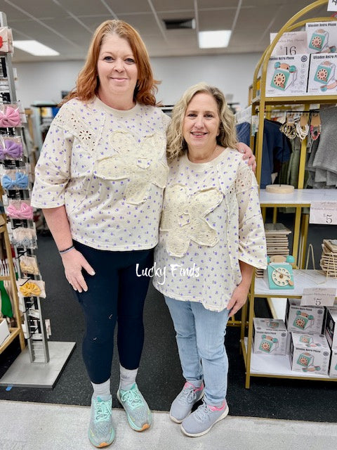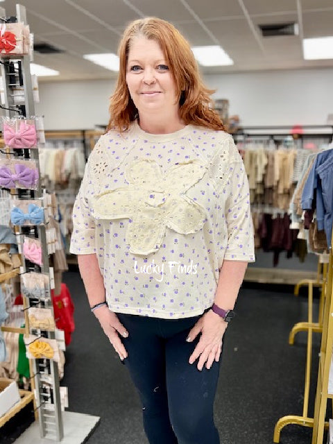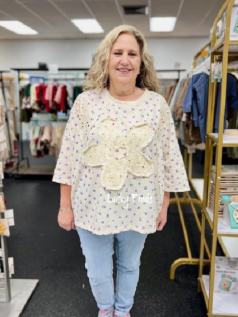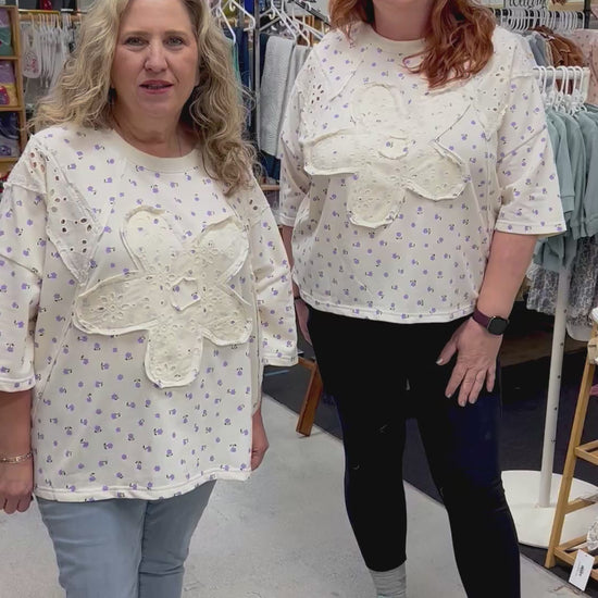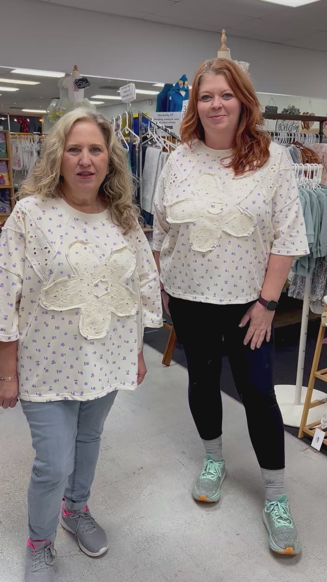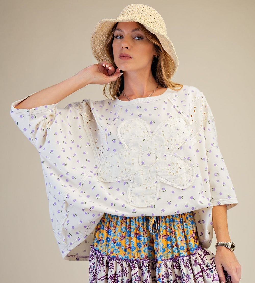 Comfy Oversized Washed Daisy Patch Terry Top w All Over Small Floral Print, Half Sleeve, Relaxed & Boxy