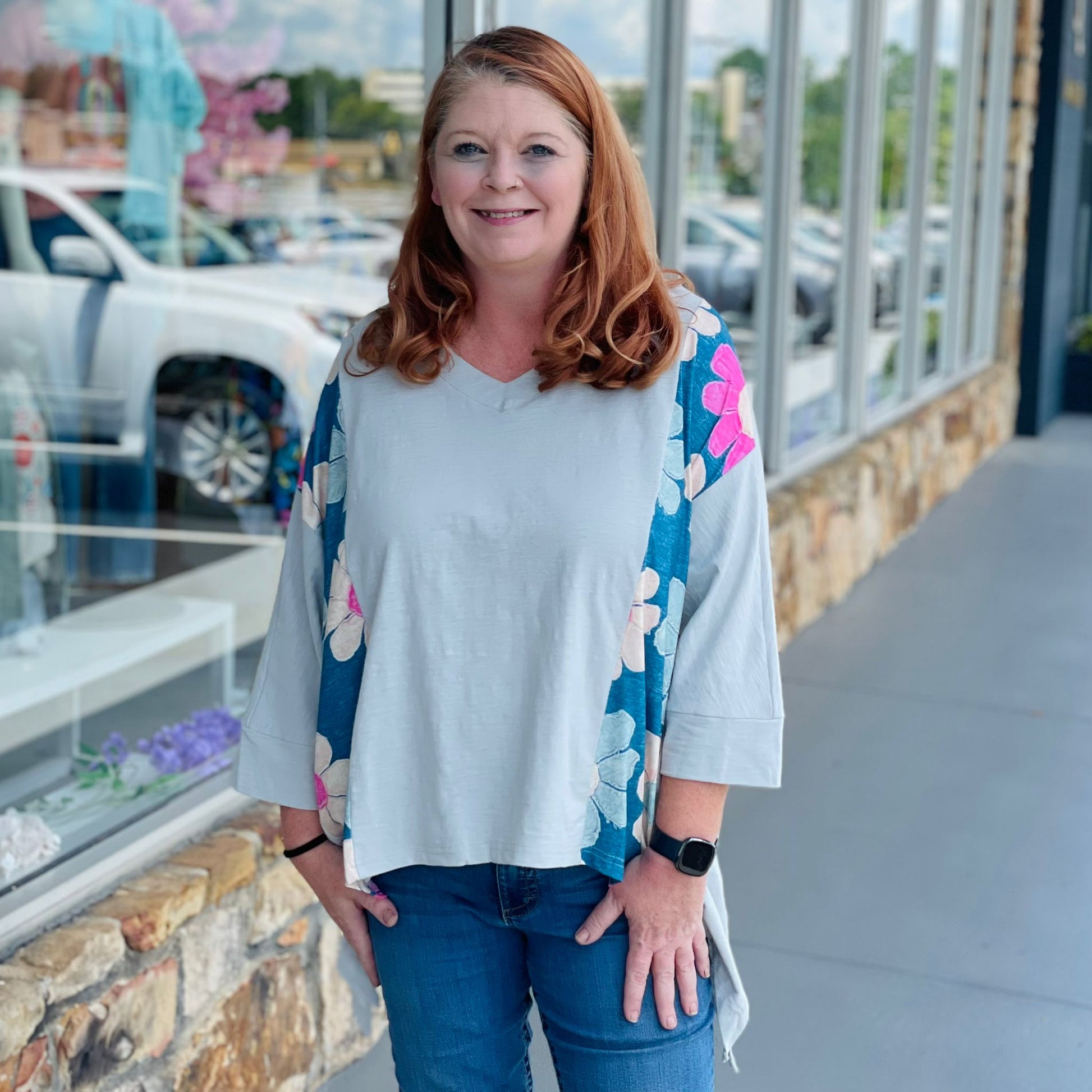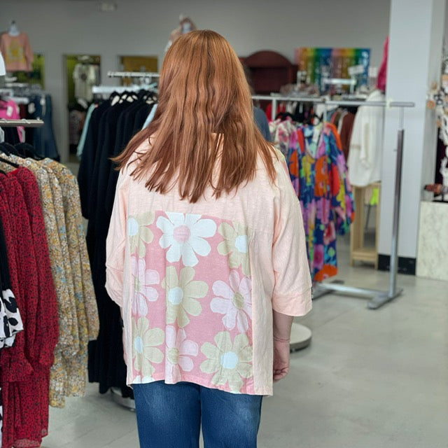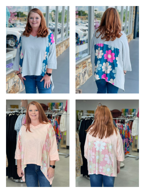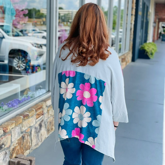 Washed Oversized Panel Top w Daisy Colorblock, V-Neckline, Drop Shoulder, 3/4 Sleeve