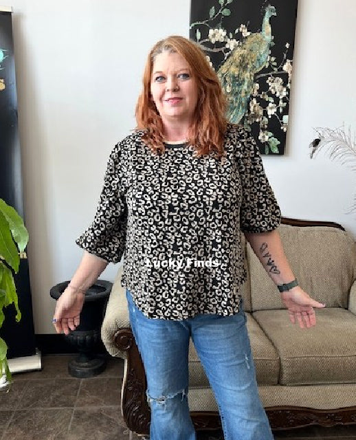 Trendy Print Jacquard Top with 3/4 Puff Sleeves, Strip Band Detail, Relaxed Fit